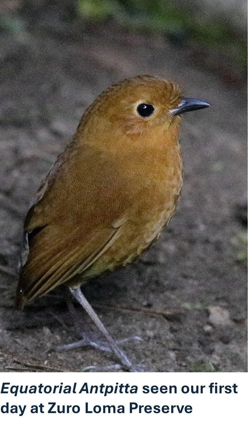 These secretive birds can now be found at places like Zuro Loma, Refugio Paz de las Aves (the first location to train antpittas), Guango Lodge, and Cabanas San Isidro. Ecuador has embraced bird tourism. As we rode around, we saw many signs promoting locations for birding. The many tour groups that visit each have their favorite locations to visit, all of them produce a wide variety of bird species. We are glad we used a tour service as identifying that many new birds would have been impossible. Also, the road system leaves much to be desired, and the drivers make our local nutjobs look sane.